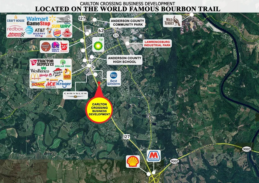 Welcome to Lawrenceburg's newest business development; Carlton Crossing! This EXCEPTIONAL CORNER LOT is located on the World Famous Bourbon Trail & talk about LOCATION, LOCATION, LOCATION! Preliminary plat offered 11 total lots, 6 have sold, & 5 currently remain so DO NOT WAIT! Only 2 corner lots still remain! BRAND NEW BEAUTIFUL FIVE STAR STATION JUST BUILT! Ideal for restaurants, retail, hotels, medical, bourbon industry, & more. Ready to go w/ turn lanes, median cut, & fully developed w/ natural gas, electric, city water/sewer, & streets. Carlton Crossing is located in the city limits & offers exceptional exposure, high rooftop counts, & stunning traffic counts! Development sits directly on TWO state highways; 4 lane US Bypass South/North HWY 127 & 2 lane state HWY Carlton Drive, plus interior roadway Legacy Way. Close to many high traffic businesses including but not limited to; Kroger, McDonalds, Wendys, Tractor Supply, Chrysler Dealership, restaurant franchises, schools, & more! Please note; Plat is preliminary & lot lines are approximate & can be adjusted or removed if desired. Broker relative to seller. Call today to schedule your showing!