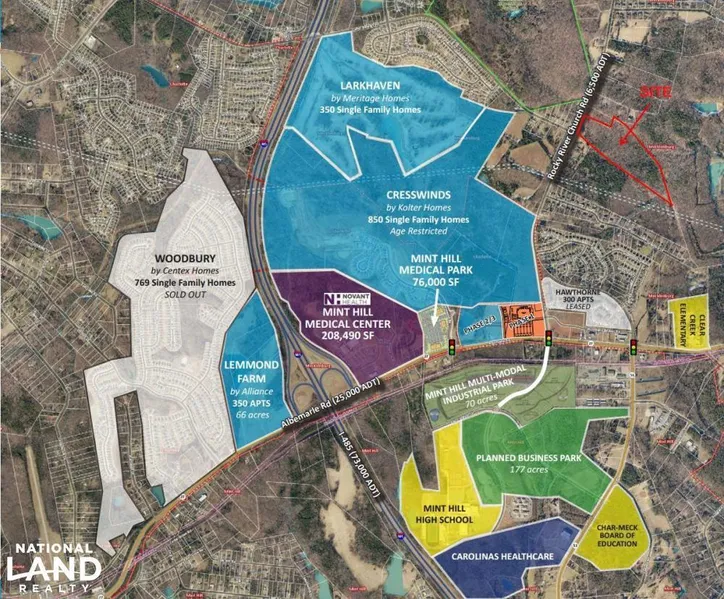 This 29 acre wooded tract is located in eastern Mecklenburg county in an area of high growth near the I-485/Albemarle Road Interchange. The site has 415 feet of frontage on Rocky River Church Road. The topography is flat on the front of the property with slopes of 9% towards the rear. There is an opportunity to combine this parcel with adjoining land to accommodate a larger project. Cresswind (850 homes), Larkhaven (350 homes), Woodbury (759 homes), Lemmond Farms (350 apartments) and Hawthorn (300 apartments) are new residential developments within 1 mile of the site. Novant Medical Center recently opened at the intersection of I-485 and Albermarle Road as have a number of eating establishments and supporting retail. Public sewer is not yet available to the site, however the Lark Haven subdivision has extended service to within 3000 feet. Capacity and access would need to be investigated through CMUD.