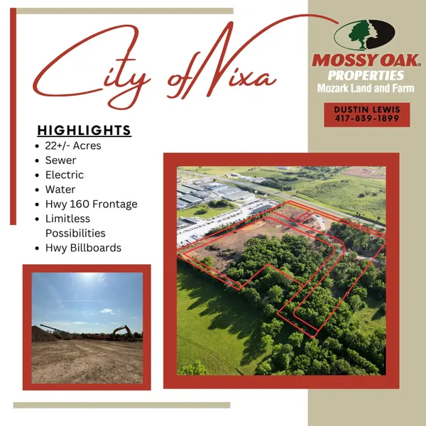 Development Potential in Nixa Located just outside the city limits sits a promising opportunity for growth and investment! This property lies in the rapidly growing community of Nixa, offering an exceptional opportunity for development. One of the defining features of this property is its exposure to Highway 160, ensuring excellent visibility and ease of access. This strategic location is ideal for businesses looking to take advantage of high traffic volumes and create a lasting presence in the area. Nixa's expansion makes it an attractive location and the surrounding area benefits from a thriving network of local businesses, schools, and recreational amenities that enhance its appeal to potential investors and developers. The sewer line has been extended to reach the south boundary of the property, simplifying the process for future construction. Water connections are accessible on the west side of the land, ensuring that essential utilities can be seamlessly integrated into development plans. From apartment buildings to commercial or residential. With roughly a 22+/- acre footprint, this property provides a blank canvas for a variety of uses and its location will continue to attract interest from developers and investors seeking to capitalize on the area's promising future.
