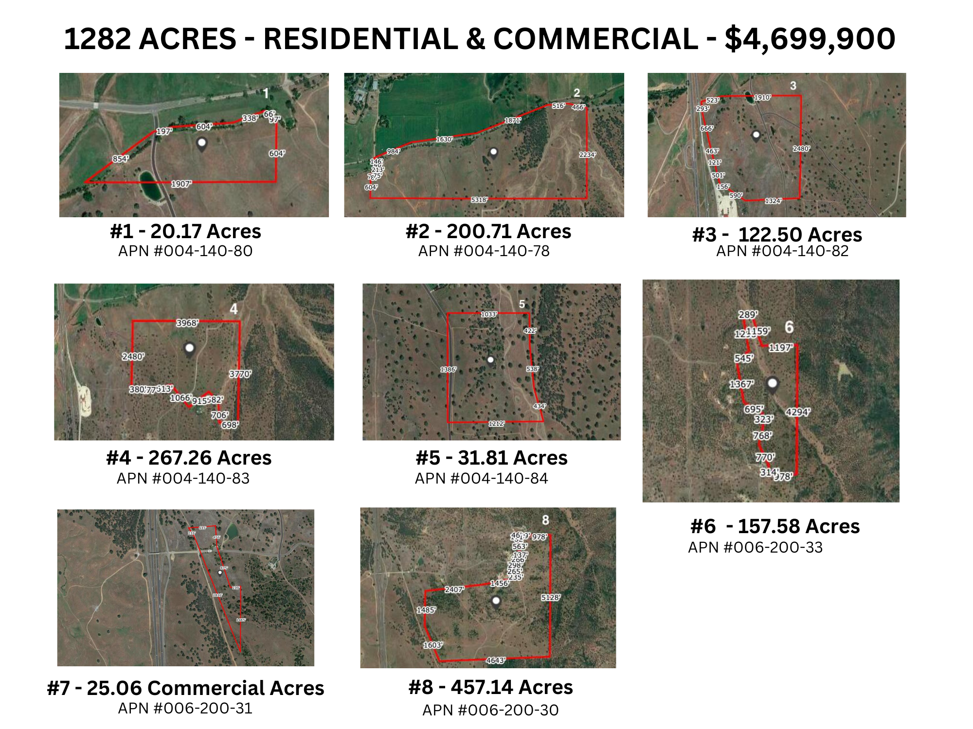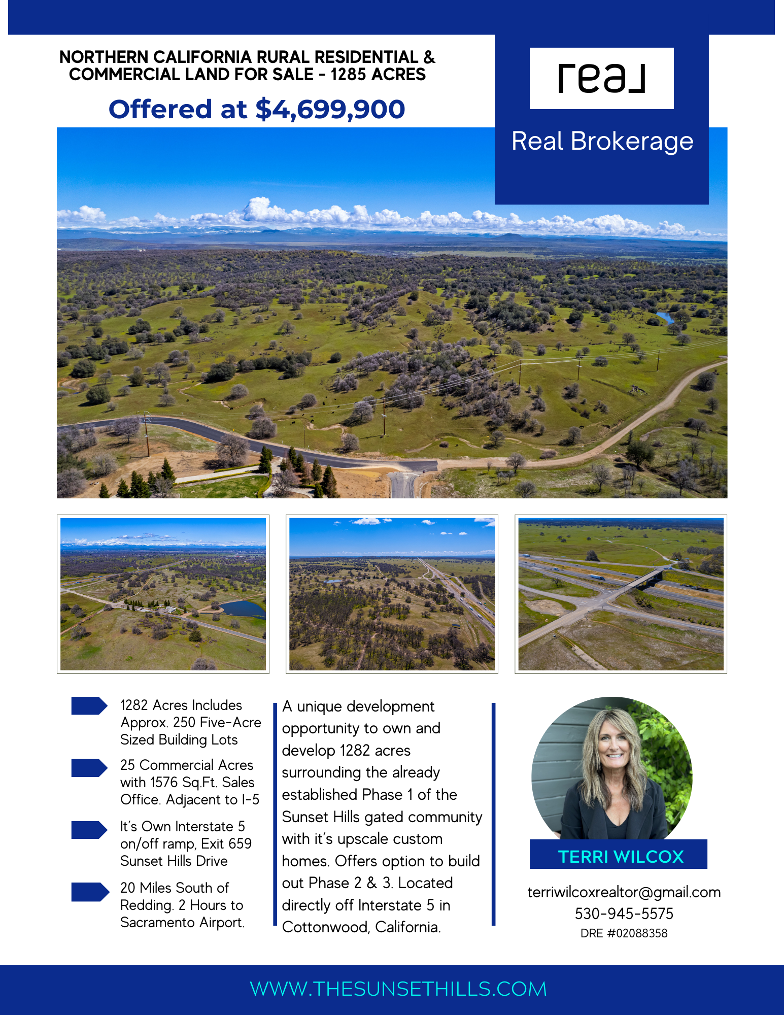 This offer has 8 separate parcels including 25 commercial acres with it's own on/off ramp, off I-5 Exit 659 (Sunset Hills Dr) which features a modern light and airy 1,576 sq. ft. sales office overlooking a large year round pond. Equipped with three office spaces, a lobby, a break room, two private restrooms, and a large meeting room. Well and septic systems are approved for future development, and an enormous aquifer underlies the property.