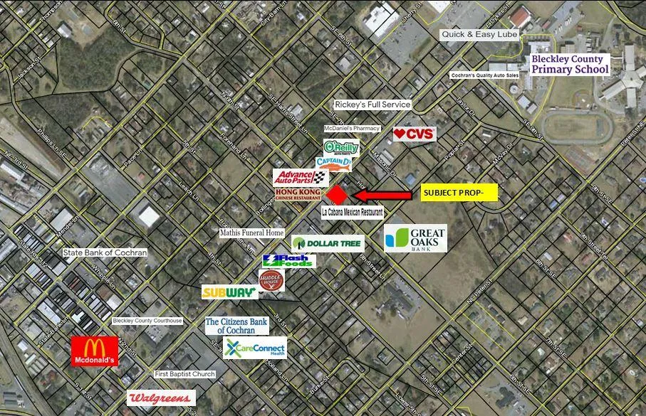 Prime corner commercial lot on E. Dykes Street & 6th Street in Cochran, GA. Surrounded by restaurants and shopping in a highly visible area. City Utilities.