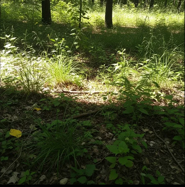 Wooded area natural, uncultivated setting.