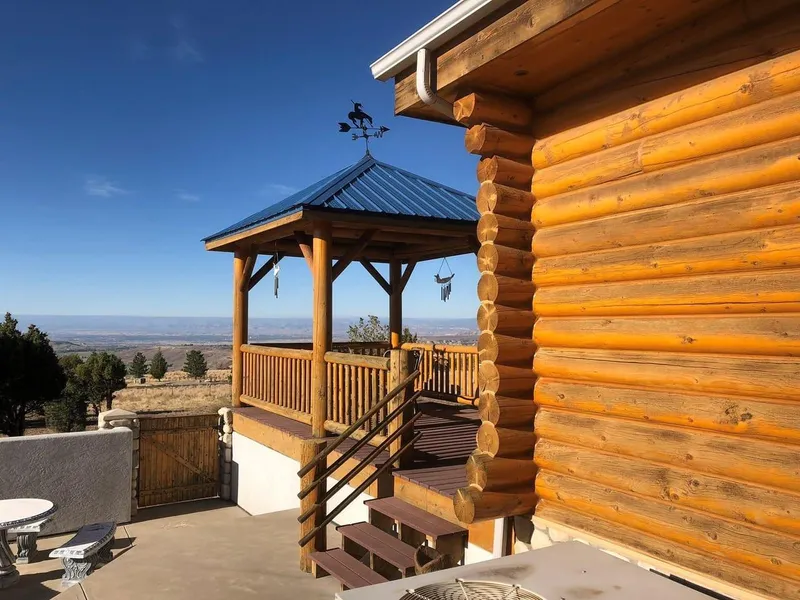 Cedaredge, CO log home on acreage has spectacular views, swimming pool This Colorado log home is the definition of "living the dream". It is a "true log home" with 9-inch logs milled from a forest near Darby, Montana. With a total area of 2,600 square feet, the home has 3 bedrooms, 4 baths, a loft area, spacious 3-car garage with office/workshop, and a swimming pool. The walls inside and out are warm, swimming pool honey-colored spruce. Situated on a 1.8-acre lot on a mesa just above Cedaredge, Colorado, the home has excellent views of several mountain ranges. The property has easy year-round access and is meticulously maintained. The grounds are meticulously landscaped, the driveway is paved with concrete, and access is very good year-round. The heated swimming pool is 16x32 with a maximum depth of 7 feet. Colorado recreation property is close to hiking, boating, sking, fishing, golf, snowmobiling The small western Colorado town of Cedaredge is situated on the southern slopes of the Grand Mesa, known as one of the greatest recreation spots in Colorado. With over 500 square miles of National Forest lands and 300 lakes, the Grand Mesa offers hiking, horseback riding, big game hunting for deer and elk, fishing, boating, snowmobiling, Nordic skiing, and there's even a small family ski area. This property is only 15-20 minutes from the top of the Grand Mesa. There's lots of golf nearby, as the Cedaredge golf course is less than a mile from the property. Located close to town, yet private and rural-easy access year round Cedar Mesa is known as a nice country residential area with acreages, ranches, large parcels, and nice residences. This home is located in a very well-kept subdivision of nice homes on Cedar Mesa. The views are excellent, with commanding views of the San Juans many miles to the south; the Uncompahgre Plateau to the west; the West Elks to the east; and the Grand Mesa to the north. At 6,300 feet in elevation, the climate is temperate, with a nice long growing season and mild winters. Cedaredge, with a very cute downtown area, art galleries, guitar shop, restaurants, grocery store, and other services. An award-winning hospital is in Delta, just 20 minutes away, along with Super WalMart, car dealers, etc. Big-box shopping and regional airports are available in Grand Junction and Montrose, each about an hour away.