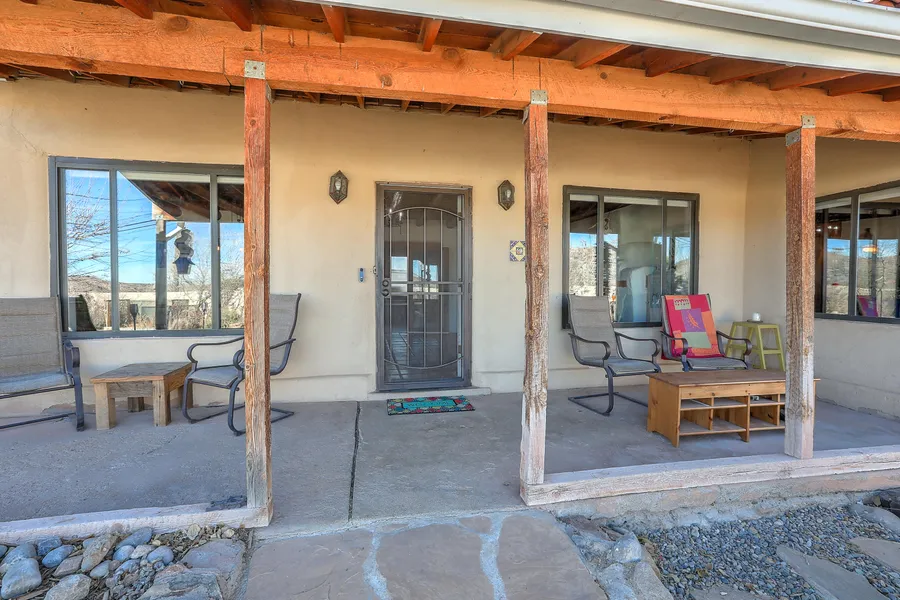 Fantastic opportunity to own a piece of Placitas history, with the earliest parts of this historic adobe home constructed over 100 years ago. This home features a passive solar sunroom, beautiful original vigas, saltillo tile and brick floors, and a kiva fireplace in the primary bedroom. The rooms are spacious and the tranquil outdoor areas include a large walled courtyard and a 20' x 40' fenced in-ground gunite pool. Nestled at the base of the beautiful Sandia Mountains with abundant acreage that affords opportunities for gardens or corrals. Includes an oversized detatched 2 car garage. This unique property is sure to impress.