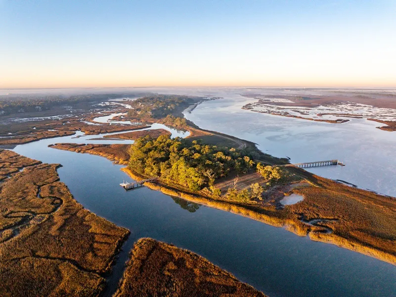 The lush, sun-dappled island itself is shaded by live oaks and other native Island trees, and yet plentiful in open spaces. Golden sunlight slanting through leaves in early morning and evening is paralleled only by sun streaming across the water at sunrise and sunset: both easily visible from the homesite.