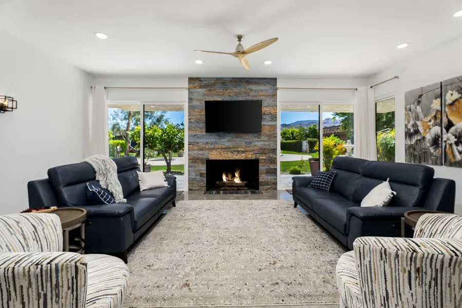 Experience unparalleled luxury in this exquisite desert oasis located within the prestigious Springs Country Club of Rancho Mirage. From the moment you enter through custom glass double doors, a striking long hallway guides you toward breathtaking south-facing views of the majestic San Jacinto Mountains, setting the tone for serene and elegant desert living. This beautifully updated home features the expanded Doral floor plan, offering 3,308 square feet of sophisticated space with three generously sized bedrooms and three spa-inspired bathrooms designed for ultimate comfort and relaxation. Gleaming high-gloss tile flooring flows seamlessly throughout the open-concept living areas, enhancing the modern aesthetic and inviting ambiance. At the heart of the home lies a newly redesigned kitchen that effortlessly connects to the living space, perfect for both entertaining and everyday living. Culinary enthusiasts will appreciate the large island, premium stainless steel appliances, and ample cabinetry. Adjacent to the kitchen, a stylish alcove bar provides an ideal spot to unwind with friends or enjoy a quiet evening cocktail. Abundant natural light pours in through skylights and soaring ceilings, creating an open, airy environment. The home boasts numerous upgrades including brand-new windows and sliding doors, recessed lighting, a built-in audio system, and updated mechanicals for enhanced comfort and energy efficiency. Owned solar panels further contribute to sustainable living. Step outside to your private outdoor sanctuary featuring multiple patios and seating areas surrounded by freshly landscaped grounds. Whether savoring morning coffee or hosting elegant gatherings, these spaces offer stunning mountain vistas and a tranquil atmosphere. Residents enjoy access to a nearby community pool that exudes a resort-like feel, nestled within a lush greenbelt and framed by breathtaking mountain views. This exceptional Rancho Mirage residence invites you to embrace a lifestyle of luxury and tranquility in one of the desert's most coveted communities. Discover the perfect blend of modern elegance and peaceful desert charm at The Springs Country Club-your dream home awaits.
