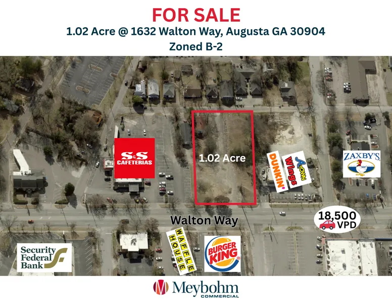 Meybohm Commercial Properties is pleased to exclusively represent this 1.02 acre lot zoned B-2 (conditional) per Richmond county, located on Walton Way along the busy central business corridor. Traffic counts along this section of Walton Way are 18,500 vehicles per day. The area consists of mix of national retailers, restaurants, medical, professional, office, Richmond County Resources as well as various residential uses. Minutes from the Downtown Medical District which includes The Charlie Norton VA Medical Center, WellStar MCG Health, and Piedmont Augusta. Owner purchased/assembled for hotel development. The site is level and all structures have been removed. Many possibilities on this site with dimensions of 199' on Walton Way X 267' deep.