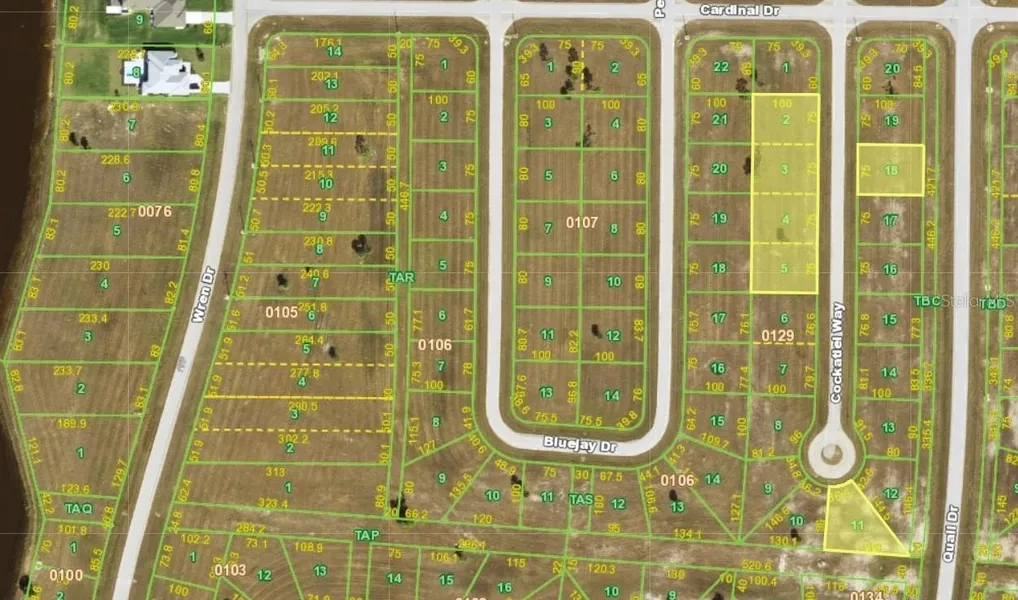 Package of six building lots in the Rotonda Meadows subdivision. This subdivision is located with in a fifteen minute drive of Boca Grande and world famous beaches. All lots are located on Cockatiel Way. The lots are cleared with central water and sewer running down the street provided by Charlotte County Utilities. Power is within the area provided by FPL. The subdivision is a deed restricted community with an active HOA. Fees are $150 per lot per year. Lots are mowed four times per year. Minimum living area for s single family home is 1,400 with a two car garage. Excellent investment opportunity or building opportunity.