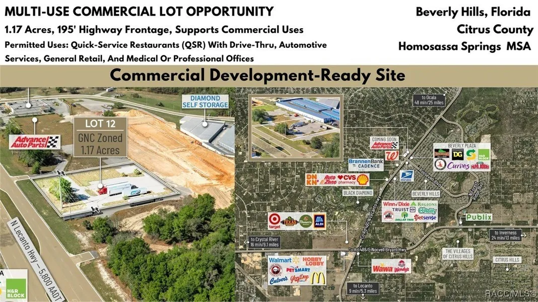 Located in the heart of Citrus County's growth corridor, Lot 12 is an outparcel within the newly developed Golden Gate in Beverly Hills, Florida. This 1.17-acre site is zoned for a variety of commercial uses, including quick-service restaurants (QSR) with drive-thru, automotive services, general retail, and medical or professional offices. It is part of a thriving development alongside established businesses such as Walgreens, Advance Auto Parts, and the new Pizza Hut with drive-thru. The property offers excellent visibility with over 195 feet of highway frontage along Hwy 491 and convenient access via the signalized intersection at N Modelwood Drive and Hwy 491. Multiple points of entry, including three from CR 491 and two from N Modelwood Drive, provide seamless connectivity to adjacent parcels through a cross-access service road, with both front and rear access to the parcel. Just 2.8 miles north of the Central Ridge regional shopping district, this location is near major retailers like Walmart, Target, Aldi, Hobby Lobby, Texas Roadhouse, Panera Bread, 7-Eleven, and other national and regional brands. The site is cleared and ready for development, with access to offsite retention for maximum lot utilization, and city water and sewer lines already in place. Additionally, shared signage will enhance the visibility of businesses located on the property. Disclaimer: All information provided herein is for marketing purposes only and is not guaranteed for accuracy. Prospective buyers or tenants are encouraged to conduct their own independent due diligence. The seller, broker, and associated parties make no representations or warranties, expressed or implied, as to the accuracy or completeness of this information. All dimensions, zoning details, financial data, and other property-related facts should be independently verified. Please consult with appropriate licensed professionals before making any investment or purchasing decisions.