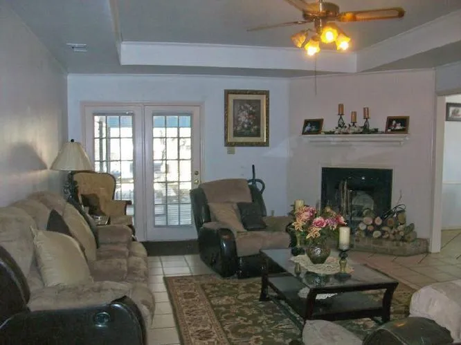 *Living Room: 17 x 15, ceramic tile, vaulted ceilings, ceiling fan, wood burning fireplace, French doors, molding.