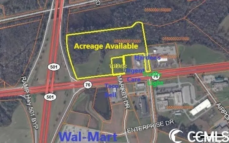 Commercial lot, surveyed 1.2 acres with additional acreage available if needed. Directly across from Taco Bell and Wal-Mart, beside Urgent Care and Hardee's with easy access road at traffic light intersection. Utilities readily available. Located on business corridor US Hwy 76 frontage between Marion and Mullins beside US Hwy 501 beach traffic corridor. Prime commercial location. Purchaser to extend existing shared access rear drive.