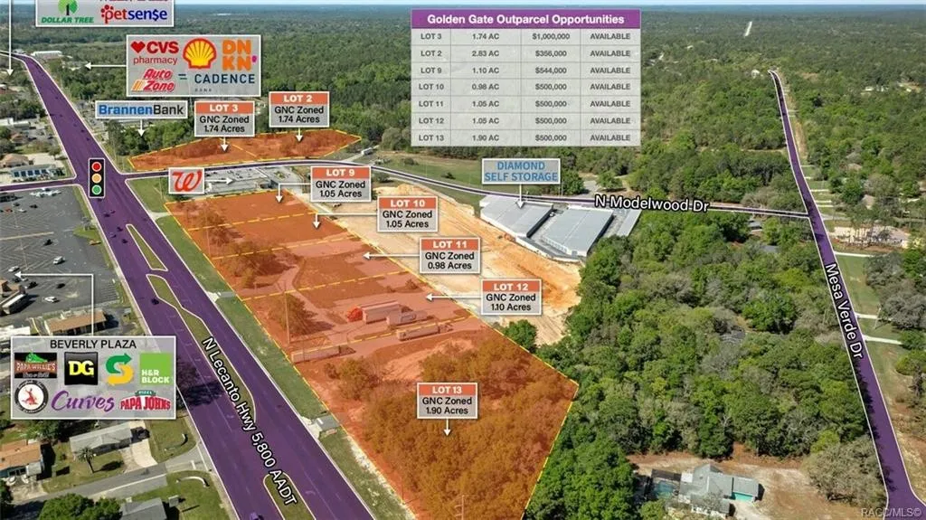Multiple outparcel Opportunity in an emerging market North of I-4 Corridor. Proud to present 7 lots of prime development land, ranging from 0.98 acres to 1.9 acres. Six of these lots are zoned GNC-General Commercial, perfect for restaurants or retail. Lot 2 is zoned PSO-Professional Service and Office, perfect for Medical and Professional Offices. Located at the center of beautiful Citrus County, these opportunities sit only 9.4 miles from Crystal River, and just 15 miles from Inverness. These opportunities are situated on the Lecanto Medical Corridor, surrounded by a large patient population. These properties sit at the center of several large and prominent communities such as Black Diamond, Beverly Hills, Terra Vista, and Pine Ridge: and are also surrounded by several popular golf courses, like Black Diamond Ranch, Pine Ridge, Twisted Oaks, Citrus Hills, and Brentwood Farms, just to name a few. Citrus County is the 34th largest county in Florida. In 2010, the population was 141,173 and has seen a massive growth of 10.21% thenceforth. Citrus County’s current LDC allows for a population of approximately 350k residencies. Get in on this amazing opportunity in an emerging market! Due to the new expansion of the Suncoast Parkway, this location is just 1 hour and 15 mins from the Tampa Saint-Petersburg MSA, the 18th largest metropolitan area in the United States.