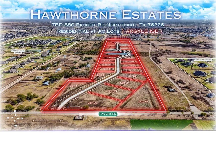 UPDATE: The Subdivision is wrapping up final details, Multiple lots have already been sold. Contact most updated Lot Availability ( Not All Lots Are Listed )!! ARGLYE ISD, BRING OWN BUILDER & NO REQUIRED START DATE !!Discover the perfect blend of tranquility and convenience at Hawthorne Estates, Located at 880 Faught Rd, brand-new community nestled in the heart of Northlake, Texas. With 27 spacious lots ranging from .9 to 1.27 acres, this haven offers a peaceful and scenic retreat for homeowners. One of Hawthorne Estates' standout features is its location within the prestigious Argyle ISD School District, renowned for being one of Texas's highest-rated school districts. An excellent education right at your doorstep, ensuring a bright future. Furthermore, this community offers easy access to nearby shopping centers and highways, making daily errands and weekend outings a breeze. Immerse yourself in the serenity of Hawthorne Estates while staying connected to the conveniences of modern life. A Destination Ready to be Called Home!