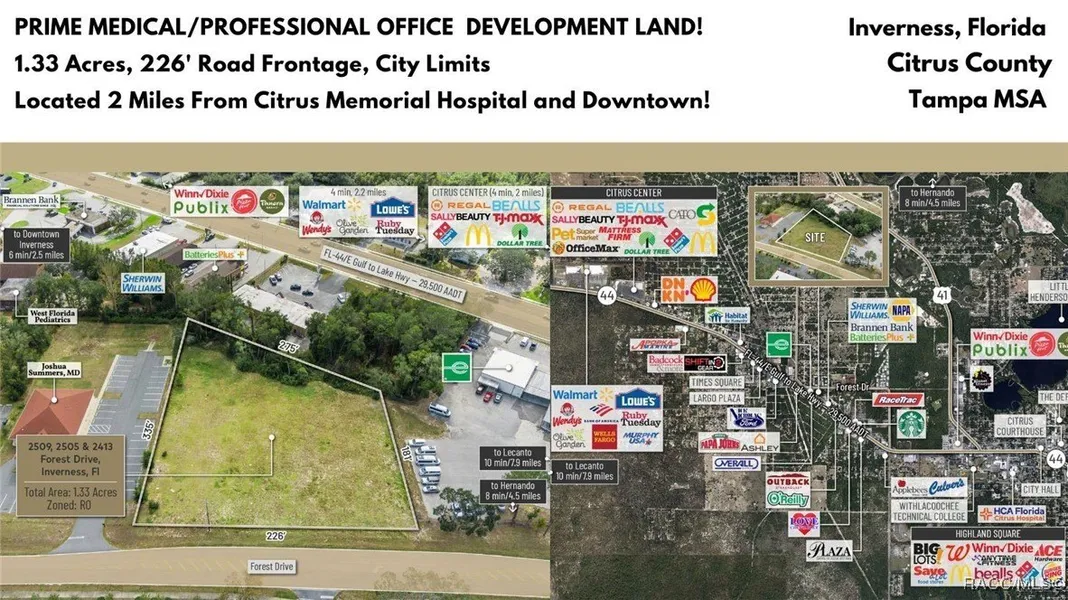 Located just off the heavily traveled SR 44 and Forest Drive, this property offers easy accessibility to a diverse patient and customer base in Inverness, situated in Citrus County, Florida. The subject property spans a generous 1.33 acres and is zoned RO-Residential Office, within the city limits of Inverness. Future connections to water and sewer services are anticipated by the end of 2025. This fully cleared property features 223 feet of road frontage on Forest Drive, which connects directly to SR 44, boasting an impressive daily traffic count of over 29,560 AADT. The property is strategically located near Historical Downtown Inverness, home to key landmarks such as Citrus Memorial Hospital, the County Courthouse, the Tax Collector's Office, and City Hall. Within a two-mile radius, the area offers a robust national retail presence, including Walmart, Lowe's, TJ Maxx, several major grocery stores, quick-service restaurants (QSRs), and sit-down dining options. The property is also situated within a 15-minute drive of a population of 36,848 residents, with a median age of 64 and a median household income of $52,000, growing at an annual rate of 2.93%. Local consumer expenditures for healthcare exceed $57 million annually, with over $20 million allocated specifically to physician services. Disclaimer: All information provided herein is for marketing purposes only and is not guaranteed for accuracy. Prospective buyers or tenants are encouraged to conduct their own independent due diligence. The seller, broker, and associated parties make no representations or warranties, expressed or implied, as to the accuracy or completeness of this information. All dimensions, zoning details, financial data, and other property-related facts should be independently verified. Please consult with appropriate licensed professionals before making any investment or purchasing decisions.