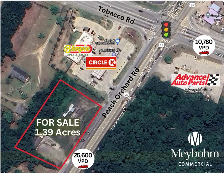 This 1.39 acre parcel is located on busy Peach Orchard Road one parcel from the intersection of Tobacco Road. This is a high traffic intersection with approximately 25,600 cars per day. The property, zoned B-2, sits next to a Circle K convenience store and benefits from 312' of road frontage. The property is flat and ideally shaped for commercial development. It is located about 2.6 miles south of Bobby Jones Expressway (I-520), making easy to access all areas of Augusta and is close to numerous other commercial and residential developments. The buildings on this land are vacant.