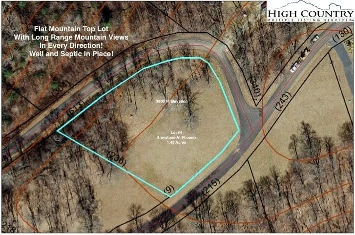 Greystone at Phoenix is a premier, gated community just north of Jefferson, NC. Featuring paved roads throughout, lush landscaping with gated entrance, and underground utilities, it's the ideal spot for your luxury mountain home. Lot #4, being one of the best lots in the community, boasts almost 360 degree long range mountain views to the highest peaks of Virginia and the surrounding NC Blue Ridge mountains. Situated at the top of Little Phoenix Mountain, it's one of the most level lots you'll find at 3600 ft elevation with a cleared and ready to build site for your dream home. A well and 4 bedroom septic system has already been installed saving you tens of thousands of dollars. There is, also, a custom home plan from Moss Creek Homes specifically designed for this lot that the seller is willing to provide to the buyer giving you the ability to hire your builder of choice and start building quickly. The towns of Jefferson and West Jefferson are a quick 10 minute drive including the Jefferson Landing Country Club and its famous golf course. The New River travels throughout Ashe County and can be accessed at multiple NC State Parks within 10-15 minutes and the multitude of outdoor recreation opportunities of the High Country are all within an easy 30-45 minute drive. Don't let this one get away. Book your showing today!