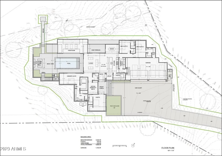Welcome to the Estates of Westwing Mountain!! This 1.5 acre hillside lot is the highest elevation lot in this private 14 lot community. Peoria approved blueprint/rendering for a 4,600 square foot single level contemporary custom home...3 bedrooms, 4 baths, plus a den/office/4th bedroom, and 4-car garage with RV space. Adjacent to the great room is a large patio with 6 roll-up doors and triple sliding glass doors leading to the sparkling pool, plus outdoor shower and bathroom... rooftop patio to enjoy the picturesque 270 degree city and mountain views, along with amazing Arizona sunrises. Casita features a spacious bedroom, full bath and kitchenette. Seller has done most of the legwork... including but not limited to city site survey, topography survey, private site survey,