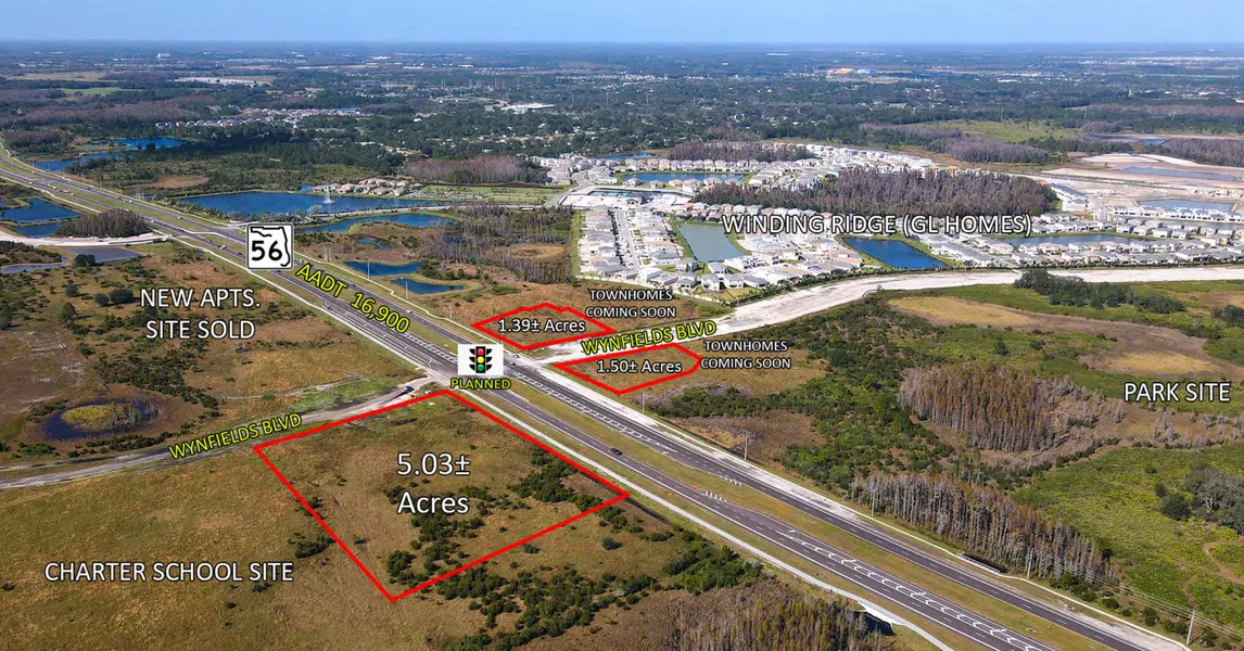 PROPERTY DESCRIPTION -The offering consists of 3 commercial parcels located on State Road 56 at Wynfields Blvd in Wesley Chapel, FL are available for sale or ground lease. There are 2 parcels located on the north side of SR 56 that are 1.39+/- & 1.50+/- Acres. The third parcel is 5.03+/- Acres and located on the south side of SR 56 east of Wynfields Blvd.