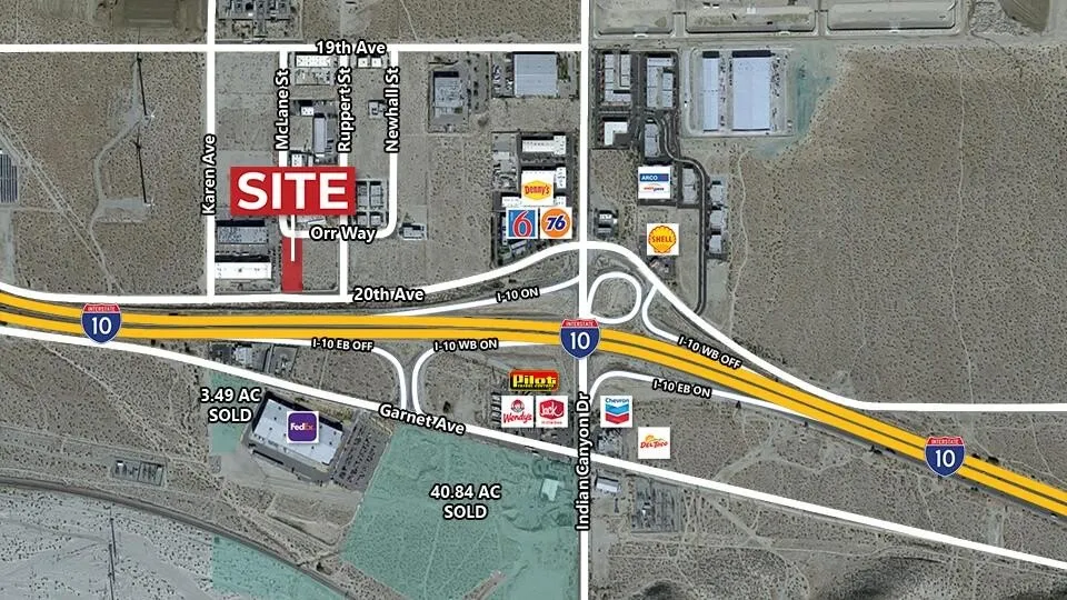 Ideal location for logistics, last-mile distribution/warehouse facility, or freeway commercial. Industrial zoning allows for a wide variety of uses. Fully improved lot with curb and sidewalk. Excellent I-10 Freeway frontage. First eastbound interchange for the Coachella Valley. 181,000 average daily traffic - Interstate 10. Just 6 miles from Palm Springs International Airport.