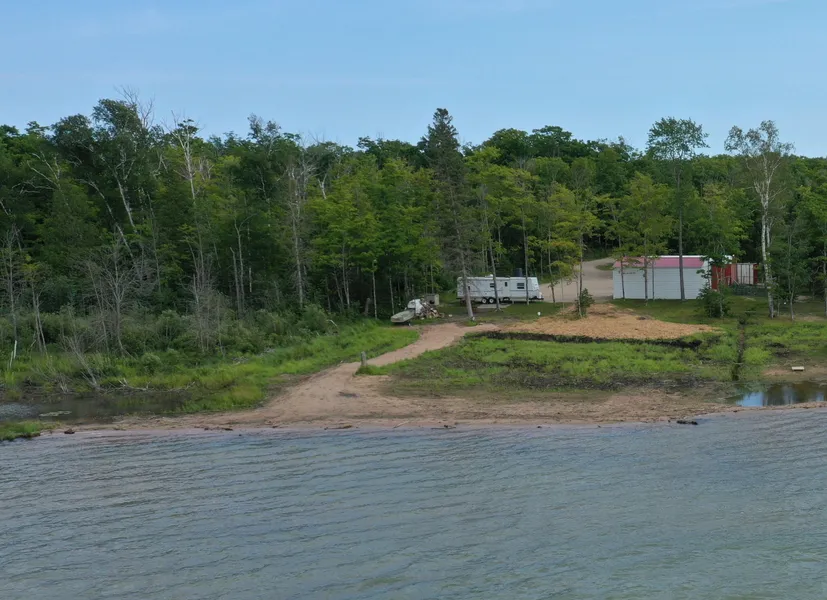 Bring the gang and a few trailers! This beautiful sandy-bottom waterfront lot includes a beautiful driveway that is installed and a carport/garage to secure your trailer. Ready to use, or prep for your waterfront dream home in the UP. Boat launches nearby give additional access to world-class fishing summer or winter. Community store is just down the road featuring rec fuel, fishing supplies and ice cream!