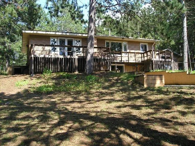 Something for everyone. Year-round home with 3 bedrooms and 2 baths. Open living/dining/kitchen area with hardwood floors and windows to the lake French door to the wrap-around deck. Walk-out basement with gas fireplace. Newer roof, windows, siding, furnace, central air, kitchen, and doors. Only 53' of frontage, but the lot is pie shaped so you have a lot of room for the 2 car garage and workshop, pole building, and greenhouse. Moderate elevation to the lake. Fish cleaning house right by the water.