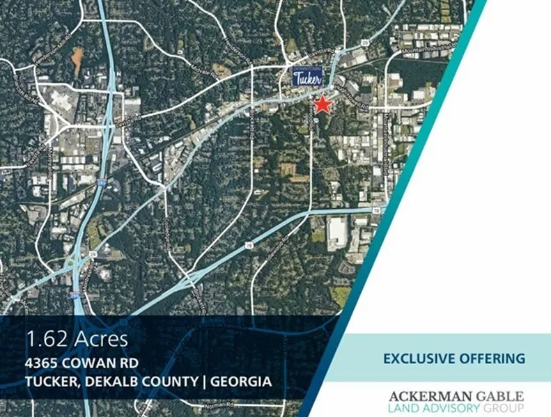 Ackerman & Co. and Gable Land Co. are pleased to present Cowan Road, a 1.62-acre site ideally located just under half a mile from Downtown Tucker in DeKalb County, GA. With approximately 250 feet of frontage on Cowan Road, excellent topography, and DT-2 zoning allowing for commercial, residential, or mixed-use development, the property is perfectly suited for a new townhouse community. Its proximity to Lawrenceville Highway, Lavista Road, and I-285 offers exceptional connectivity, while Downtown Tucker provides a vibrant mix of dining, retail, and entertainment just steps away.
