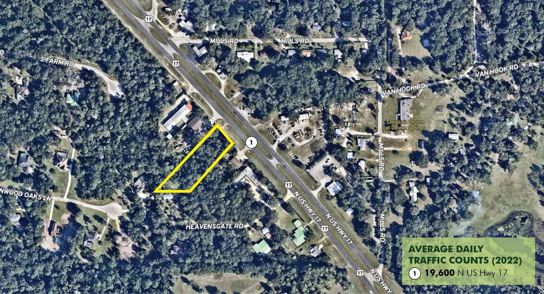 Frontage on US Hwy 17 in DeLeon Springs! Situated on 1.6 acres along US N Hwy 17 in DeLeon Springs, this commercial property boasts excellent visibility, with an average traffic count of 19,600. Positioned within an X flood zone, the entire site is fully developable, offering an ideal opportunity for investment or development with prime exposure along US Hwy 17. Additionally, water and sewer services have been newly extended to DeLeon Springs, further enhancing the propertys potential.