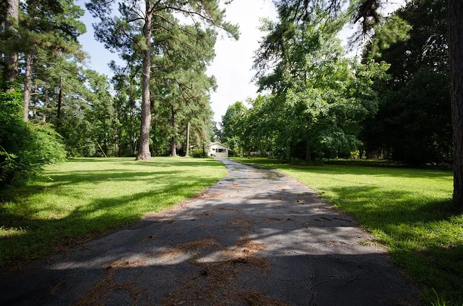 Accessed by a winding asphalt drive, the property is fenced, is heavily wooded with mature pines, hardwoods, and features a garden area, grape arbor, and is landscaped with a variety of interesting flowering plants and small trees including: empress trees (dragon tree), holly trees, canna lilies, spider lilies, and a hedge of wisteria along the highway.