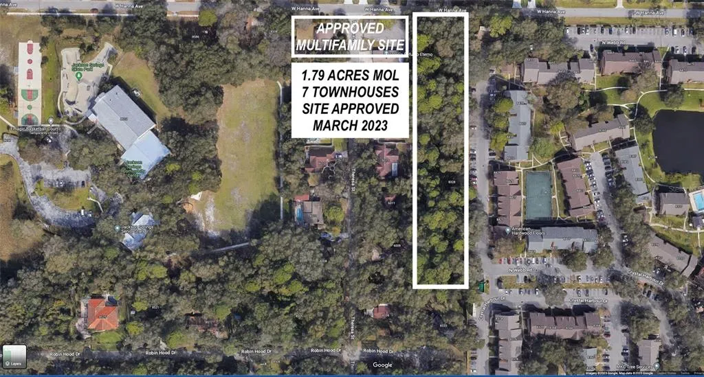 MOTIVATED SELLER WITH SITE APPROVAL ** 7 UNIT MULTIFAMILY TOWNHOME DEVELOPMENT SITE** 1.8 ACRE MOL. -ZONED RMC-6 SITE APPROVED 3/27/2023 HILLSBOROUGH COUNTY FOR DEVELOPMENT. 123 FEET OF FRONTAGE ON HANNA AVE OVER 623 FT DEPTH. 1.8 Acres MOL. TOWN N COUNTRY - JACKSON SPRINGS COMMUNITY IS Walking distance to HOSPITALS, SHOPPING, INTERSECTION OF WEST HILLSBOROUGH AVE AND SHELDON AND MEMORIAL. CONVENIENT TO TAMPA INTERNATIONAL AND BEACHES. 2 ADJACENT AND ASSEMBLED PARCELS INCLUDED IN SALE. MULTIFAMILY PROPERTY DEVELOPMENT PROJECT. Conveniently located within minutes to Tampa International, West Hillsborough & Memorial , HOSPITAL, PUBLIC TRANSPORTATION, PARKS, Walking Distance, Publix, Starbucks, The Home Depot, Ben Davis Beach and Courtney Campbell Causeway to Clearwater. TOWN N COUNTRY. ADDITIONAL FOLIO # 006713-0000 INCLUDED IN SALE