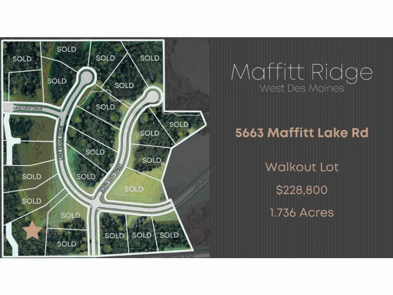 Maffitt Ridge is one of West Des Moines' most environmentally sensitive new developments. Consisting of 38 estate lots ranging from 0.92-2.902 acres with walkout lots still available. The neighborhood is heavily wooded with an abundance of wildflowers, native prairie grasses, wildlife, and paved walking trail. Located in West Des Moines School district this is one of the most private settings in the metro and just minutes away from all the conveniences of West Glen and Jordan Creek Town Center. This development is builder friendly and allows you to choose your own. Panoramic views and adjacent to Maffitt Lake with an 1,500 acre park and reservoir, fishing from public docks and 4.5 miles of hiking trails. Public services including: CITY SEWER, CITY WATER, street maintenance snow and garbage removal!