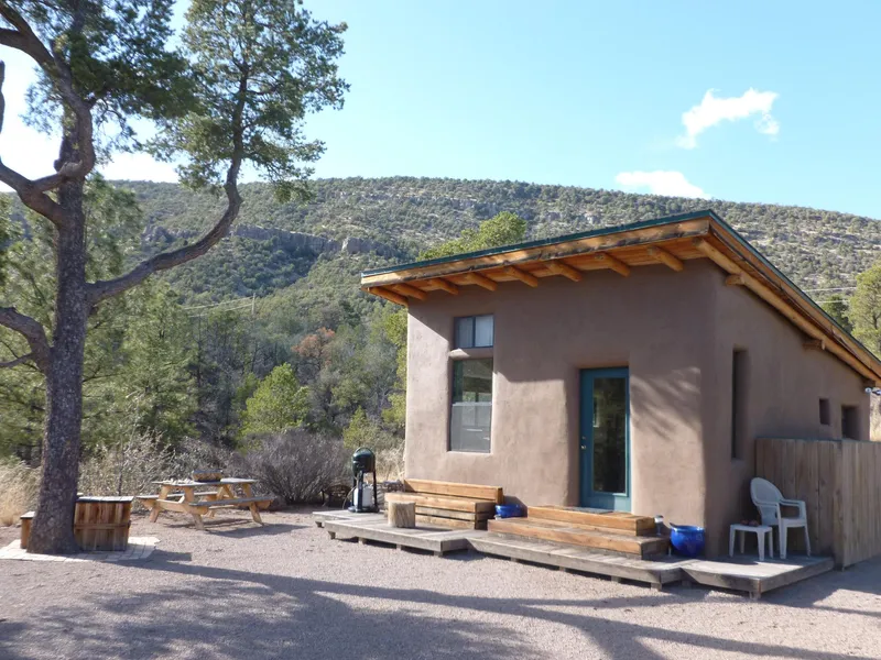 Crafted with straw bale construction this cabin is very energy efficient. The owners use wood for heating along with passive solar sun heat in the winter. The overhang shades the cabin in the summer so it remains really comfortable and cool.