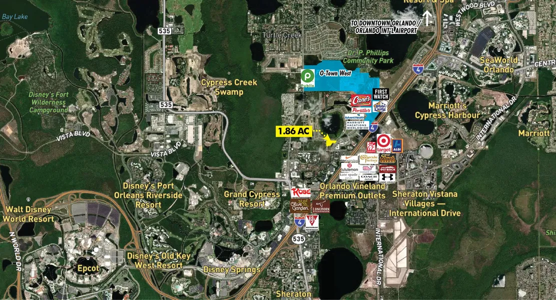 Price Reduction!! Prime location! The property is located within the International Drive/Palm Parkway Corridor in the Dr. Phillips submarket of Orlando. See flyer for area information. The property is positioned and ready for development with great frontage, visibility and infrastructure in place. Just north of the property is the rapidly developing and high end O-Town West development. A full interchange in development now gives the property convenient access to I-4, and therefore all of Orlando. Across I-4 is the Orlando Vineland Premium Outlets.