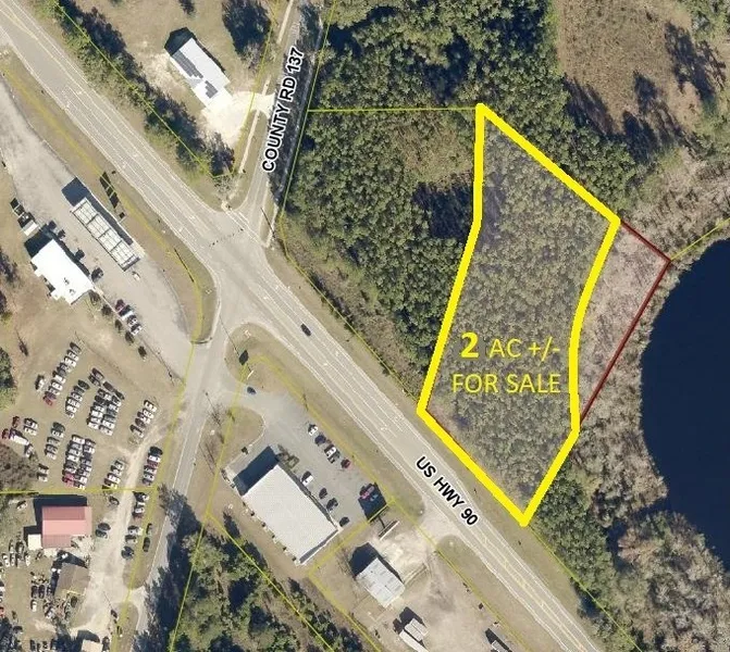 Great location between Lake City & Live Oak, FL. Frontage on US HWY-90 is a great opportunity for maximum exposure. Of the parcel, only the 1.97 acres in planted pines are for sale, none of the 1.97 acres are in a flood zone. Zoned commercial. Has been Surveyed (see links and documents) Contact agent for detailed documents.