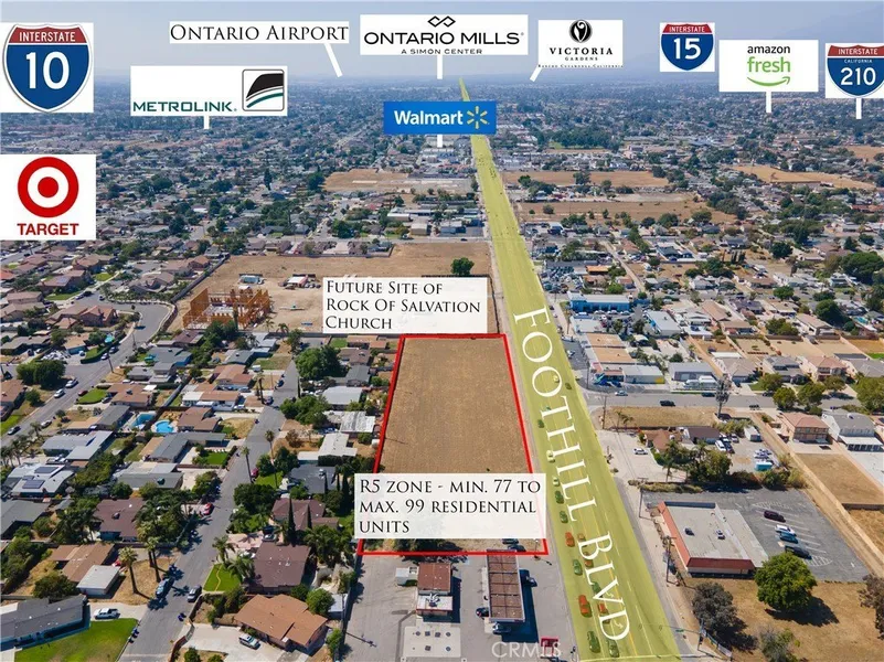 R5-zoned (High Density Residential) opportunity on a 1.99 acre, rectangular, level lot with wide frontage along historic Route 66 (Foothill Blvd). Parcels can be sold separately (0246-231-14,0246-231-15). This prime property offers the potential to develop 77 to 99 residential units in the fast-growing city of Fontana. In 2023, the City of Fontana amended its Form-Based Code, focusing on multi-family housing and mixed-use development as part of the State’s SB2 Grant and Downtown Core Project. Fontana is expected to grow by an estimated 10,000 new residents by 2025, positioning this property as an ideal site for future development. Strategically located at the crossroads of major trade routes, the property’s role as a hub for supply chains makes it a vital part of the Inland Empire, offering excellent access for commuters and businesses alike. Bordering Rancho Cucamonga, Ontario, and Rialto, the property is near major freeways, including SR-210, I-10, and I-15. Adjacent to the property, the Rock of Salvation Church, Fontana’s newest place of public assembly, is set to transform a portion of the street between Laurel and Locust, enhancing the vibrancy of the area. Nearby Future Site of High-Speed Train to Las Vegas. High-density housing projects are actively being developed nearby, with several developers already applying for permits, demonstrating strong growth and demand for residential opportunities. Additionally, commercial development is booming, further solidifying the area’s appeal as a hub for both residential and business expansion. Fontana’s commitment to long-term growth is reflected in its robust infrastructure improvements, including the Bob Weddle Capital Improvement Program, the South Fontana Recycled Water Project, and multiple parks planned for construction near the property. Situated close to major retail hubs like Victoria Gardens, Ontario Mills, and newly opened grocery stores (Amazon Fresh, Grocery Outlet, and more), as well as Kaiser Permanente Medical Center and Ontario International Airport, this property is ideal for high-density residential development. The location also provides easy access to major employment centers, including Amazon, Target, UPS, and other distribution hubs, making it a highly desirable investment. Check with the city for Density Bonus Program.