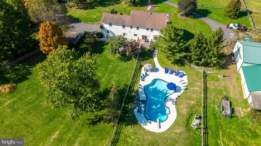 Welcome to this rare find set on one of the prettiest roads in Bedminster Township, an area rich in history, sprawling horse farms and idyllic Pennsylvania homesteads. A long tree-lined driveway marks the entry to this picturesque Bucks County farm nestled within a lush tree-lined setting that offers privacy and serenity. Bring your horses/pigs/goats to this country retreat nestled on 10 secluded acres offering stunning long-distance views. Enjoy exploring two acres of adjacent wooded area where you can follow a beautiful stream and glimpse diverse wildlife along the way. Included are 3 sprawling fenced pastures and 2 horse stall barns. The newer, larger one has 6 stalls, 2 gates, a private office and its own well pump. The smaller barn offers an additional 2 stalls plus a carport to protect your tractor or mower. Adding to this property's ambiance is the newly constructed Blue Haven in-ground, heated saltwater pool with oversized pool deck that is completely fenced for safety. Alongside the pool is a separate fenced area for your puppies or kids to play. This lovely colonial property boasts exquisite grounds that you'll gaze at as you walk down a brick paved walkway along the front and pass a secondary entrance. Further down, a covered front portico at the main entrance leads to a freshly painted foyer. The center hall features hardwood flooring and a large coat closet. To the left of the foyer is the living room with built-in bookshelves and pocket doors that makes it easy to double as a great home office. To the right of the foyer is the formal dining room with hardwood flooring - an ideal place to host your next holiday dinner! The heart of the home is a remodeled kitchen featuring beautiful solid wood cabinetry, granite surface counters with a huge center island and brand-new appliances. The sunny breakfast area is a perfect place to sit and have your morning coffee as you admire the beauty of the grounds. Then, open the glass slider door and step out onto the maintenance-free deck. The kitchen opens up to the family room, which features a Philadelphia brick fireplace with a wood-burning stove complete with exterior hatch for firewood. A gorgeous bay window makes this room sunny and warm. A powder room and oversized laundry room finish off this stunning level. The laundry area features several closets for storage, exits to the front and rear of the home, plus entrance to a two-car garage. Climb a second staircase that leads to a spacious upstairs bedroom (which currently serves as a great office) and a large sitting room. This is a perfect retreat for overnight guests, an Au Pair, or can be turned into an ultimate teenage suite. Also upstairs is the freshly painted main bedroom suite with nicely sized closets and an impressive ensuite bathroom. Three additional bedrooms all feature ample closet space and share an updated, full-hall bathroom with tub/shower combo. All upstairs rooms are equipped with ceiling fans. You will find even more living space back downstairs, where a large, finished walkout basement level offers a cozy fireplace, full kitchen with oversized island, and a full bathroom. This makes a perfect space for hosting large gatherings or coming in from the pool or barn area. Additionally, this immaculate home comes with a whole-house propane generator, 2 zones of heating and cooling, a new 5-bed septic tank installed in 2020, and a sturdy roof constructed in 2006. Best of all, the property has been granted a Farmstead property tax exclusion - which means LOW TAXES! You will fall in love with this bucolic setting in the Pennridge School District that's convenient to Doylestown, Perkasie and Quakertown for all your essential and entertaining needs. Come out to see your Forever Farm Home‹? waiting for you in beautiful Bedminster!