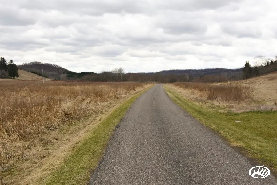 - Timbered hillsides behind, CRP grass with babbling brook in front