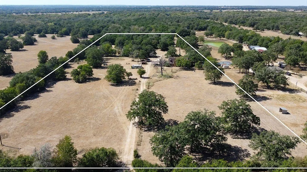 The front of the property boasts open spaces with scattered trees, perfect for livestock or outdoor activities. The back offers more dense hardwoods, providing privacy and a natural backdrop.