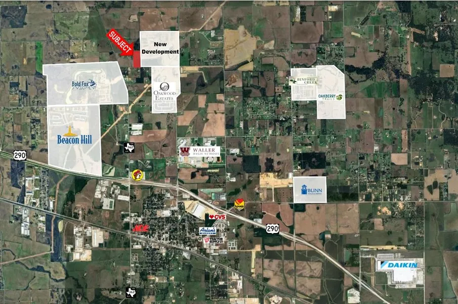 Fenced on three sides and easily accessible from Hwy 290, the property is centrally located between 3 new large subdivisions (Oakwood Estates, Beacon Hill & Attwater), making it a prime location for growth and future returns. Adjoining 207 acres is an unnamed residential development. Conveniently located near top-rated schools, shopping, and other local amenities.