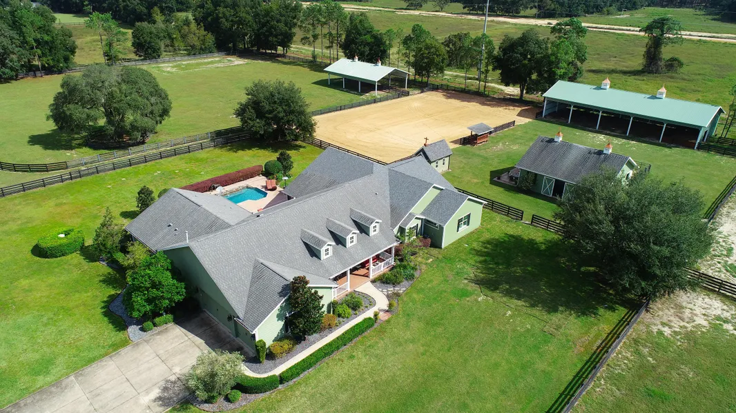 Great Location! Minutes away from restaurants, shopping, hospitals and 15 minutes to the World Equestrian Center Wingspread Farm - Gorgeous Home and Equestrian Estate on 7 Acres. Immaculate! Attention to details are the first things you notice as you enter this unique property featuring a 4 bedroom, 3.5 bath residence, private chapel, Exquisite 4 stall show stable with office plus 100'x40' multi-purpose building with a 20' x 40' stall which could be divided into 1, 2 or 3 stalls. Luxurious expansive run-ins provide shade for horses in lush paddocks with automatic waterers. Irrigated Arena. Main Home: Main residence is very inviting, perfect for entertaining with an open floor plan and split bedroom layout for privacy. Chef's kitchen with gas range, island bar, and an abundance of custom cabinetry overlook family gathering room with fireplace. Just completed 1,500 SF incredible addition which includes: 2nd laundry room, expansive closets, sitting area and exercise room. Generator will operate home and stable. Enjoy the tranquil setting of this beautiful heated, saltwater pool-perfect for swimming laps or just enjoying the water. Summer kitchen, lanai, and fire pit complete this private outdoor setting. Additional acreage also available.