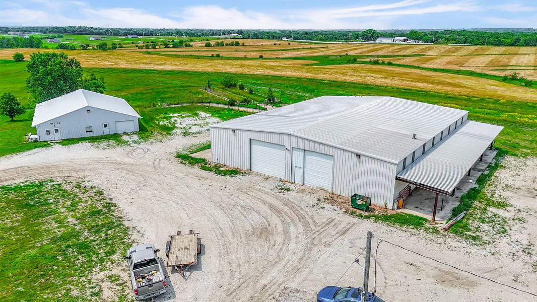 The first outbuilding is a 60x60 building with two bathrooms, HVAC, office space, and an overhead door for easy access.
