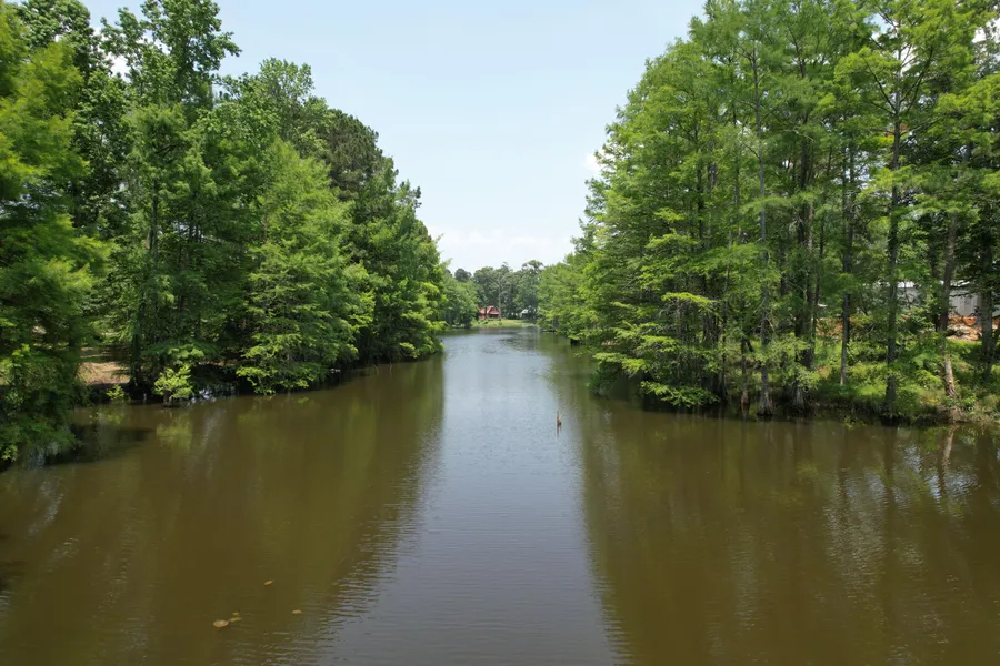 The property is high and dry along Tom Low Dr and then eventually slopes off towards the lake. The lake itself runs into the cove here and the entire cove is encompassed by the property on both sides. The headwaters of the cove is a very scenic cypress-lined waterway.