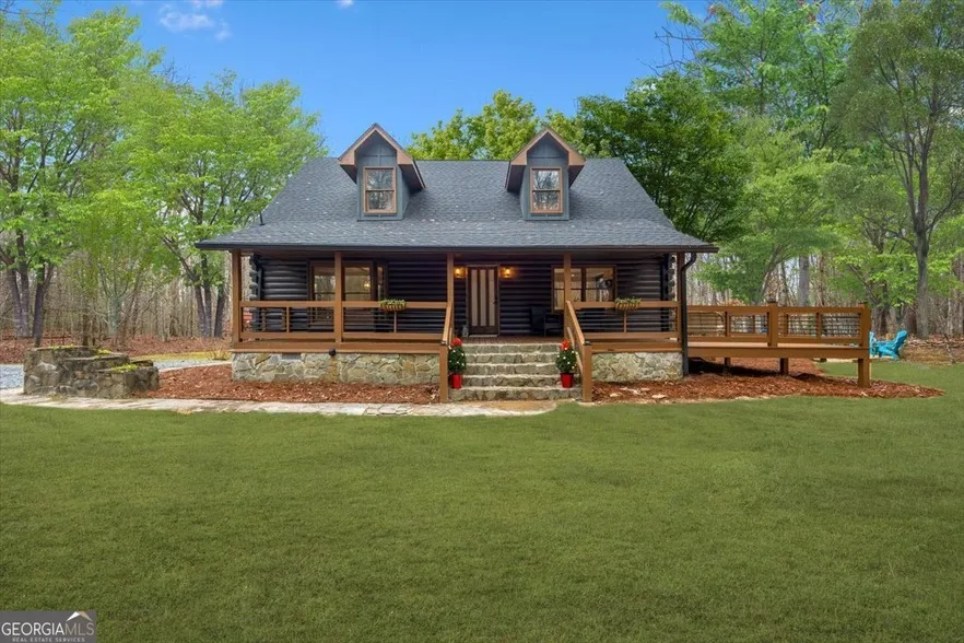 MOTIVATED SELLER! Perfectly Renovated Log Cabin nestled on 1.9 private acres ONLY 13 minutes from Downtown Blue Ridge & 11 mins from Mercier Orchards! Paved roads lead to your Mountain Haven complete w/ Gated Driveway + RV Hookup | The yard offers flat grassy areas + beautiful landscaping set against a backdrop of hardwoods & evergreens. Relax on the wraparound porch, gather around the firepit, or unwind in the brand new 6-person hot tub. The Great Room features soaring tongue & groove ceilings, magnificent stone fireplace, and stunning chandelier. The tucked away Main Level Secondary Bedroom has Full Bath across the Hall. The kitchen features breakfast bar, tons of storage, leathered granite counters, breakfast bar + new Stainless Appliances. The elegant Dining Room opens to the kitchen | Heading up the curved wooden staircase, lovely arched doorways & a catwalk overlook the great room. The upper level Primary Suite features 2 closets, a sitting area, T&G ceilings, a luxurious chandelier, and ensuite bathroom w/ custom tile shower. The office has vaulted ceilings w/ an arched entrance & French doors leading to the full length back deck overlooking wooded views. A large bright secondary bedroom completes the upper level | The Terrace Level has three large flex spaces-the perfect setting for a billiards room, gym, family room, In-law Suite, or bunk room. The Terrace Level includes a large, bright Bedroom + ensuite Full Bath w/ live edge shelving & tile shower. Two new sliding doors lead to the backyard & hot tub | Other upgrades: 5-ton HVAC system, fresh stain, refinished hardwood floors, new roof, & new hot water heater. Whether you're seeking a full-time residence, a vacation getaway, or a lucrative Airbnb rental (rental estimates of $55-65k), this exceptional property offers it all! Can be sold furnished! Check out the Virtual Tour: Back on the market after Buyer decided not to move.