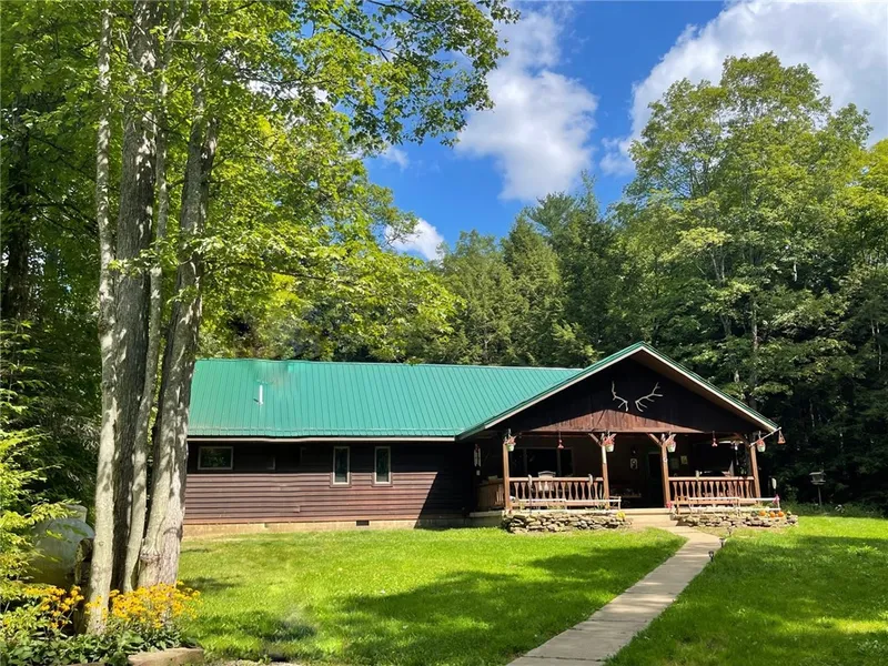 AS CLOSE TO THE ALLEGHENY NATIONAL FOREST AS YOU CAN GET! Nature abounds this unique style home that offers the perfect setting for the homeowner looking for peace and quiet adjacent to the forest. Enter the foyer from the large covered front porch. The living room boasts of nature with the wooden walls, beams, hardwood floors and large picture window. Eat in kitchen w/ dining area that opens to the side porch to bring nature to your doorstep. Step up to the Family room w/cathedral ceiling and great windows. Master Bedroom with full bath and shower. Laundry room and full bath on 1st floor. Renovated 2nd floor offers 2 spacious bedrooms with a 3/4 bath in between. Stairways at each end. The 52 x 26 garage w/2 garage doors, workshop, cement floor, 1/2 bath, electric, water, septic and more is definitely a bonus. The setting speaks for itself with a covered bridge over the stream with a fire pit and a 100 yard shooting range for the active sportsman. Close to everything nature and 5 minutes away from the Willow Bay Recreation area for boating, fishing, trails and more. Must be Pre Approved for showings.