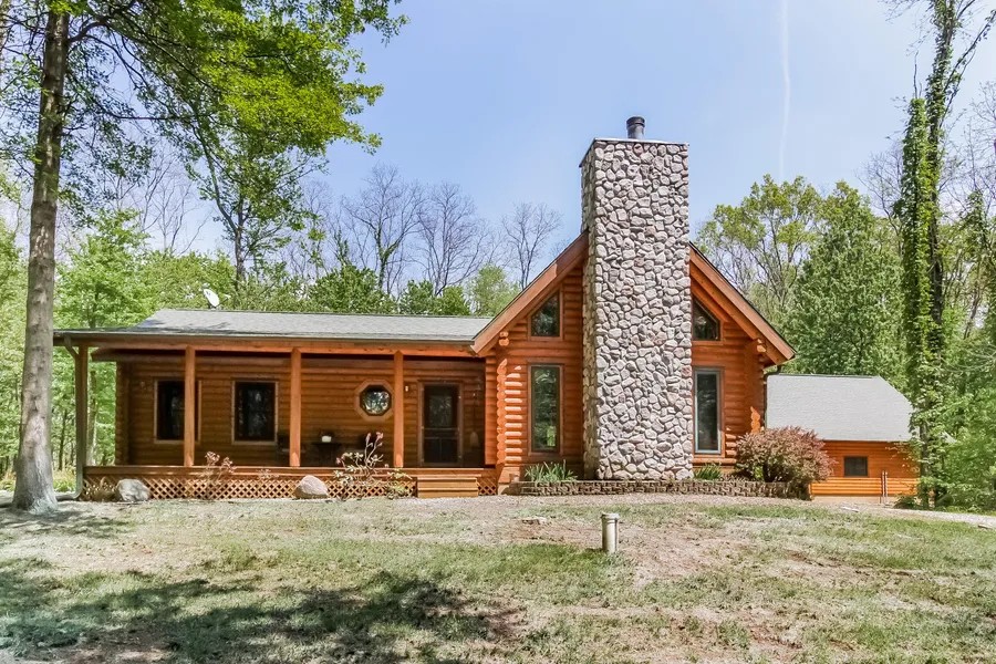 This Southwest Michigan wooded hideaway is on 10 pristine acres with the Rocky River winding through the middle of the parcel. The dwelling is a spectacular 2254 ft, 3BR 2BA CUSTOM LOG HOME. Its lofty beams, and large stone fireplace yield an up-north cottage coziness. It features a spacious open floor plan, 1st floor laundry and many extras unique to high quality log homes. Its partly finished full basement with 9' ceilings could accommodate a number of uses and activities. The attractive 28x28 detached garage features a finished second level with a man cave, a bar and a balcony. There is also a utility shed for the gardener. This country home is nicely landscaped and perched on a ridge above the wooded river basin. A winding pathway leads down a gentle slop through the hardwoods to a park-like setting and friendly gazebo that's just waiting for you and your current novel or a family picnic at the river's edge. This picturesque spot is frequented by whitetail deer and a menagerie of birds and other wildlife.