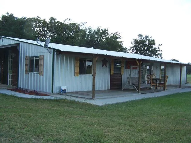 BARNDOMINIUM-Expand your horizons! Abundant space is available in this unique home on 10.571 acres and you can sit outside on the covered decks and enjoy the country. Pretty land offers alot of road frontage for privacy with good fencing, treed areas and winding drive. Home has recently been completed with updates throughout. Rustic accents can be found in the wide open space for living/dining, private office and really cute kitchen. Private bath for each bedroom and office. Concrete cabinet tops, island/breakfast area plus huge pantry. Storage building or workshop included. Energy Efficient home!