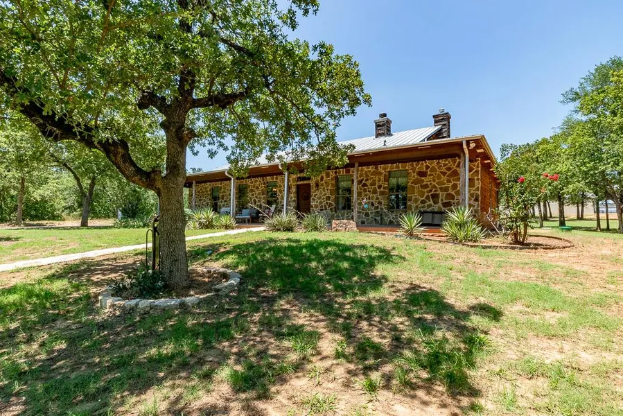 This property features a 3-bedroom, 2.1-bath stone home with cedar trim and Austin stone finishes. Built in 2005, the 2,268 sq ft home includes an open concept living area, stained concrete floors, vaulted ceilings with exposed beams, and a stone fireplace. The property comprises gently sloping terrain with oak trees, transitioning to open pastureland and horse facilities, including a large steel building with a covered arena, horse barn, and equipment storage. Additional features include a gated entrance, upgraded electrical systems, and a small stock pond. Priced at $1,495,000.