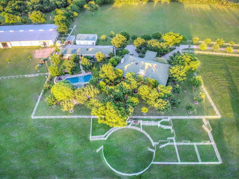 THE ADVENTURE BEGINS...a corner parcel with pipe and five cable fencing. A secure and welcoming entry. A concrete drive (1,300+ ft), tree lined, lighted, irrigation and flanked by a 20 acre pasture to the north and a 30 acre pasture to the south. A circle drive and Porte de Cochere welcomes family and friends.. A 360 degree wrap around porch opens views of the various aspects of the ranch. Car collector... multiple barns, garages to house your collection with concrete access. An indoor arena, insulated, misting system, viewing area, stalls, runs, wash area, hay storage and one bedroom one bath apartment.