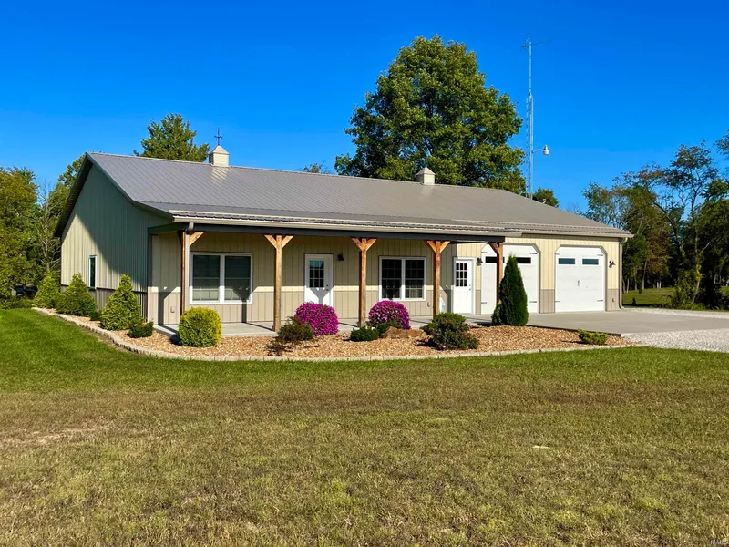 Immaculate property with approximately 5.25 acres of manicured yard and beautiful country-like setting. 50x120 pole barn with part concrete/part gravel floor and elec. Gated entry drive leading to the 2000 sq. ft. home offering 2 covered porches and a 29x35 attached garage. Open floor plan with 10 ft. ceilings offering an island in the kitchen, laminate flooring and carpet. Wonderful main bedroom with full bathroom and large walk-in closet. 2 secondary bedrooms. Great covered front and back porches. Quality built home by Graber Post. Greenhouse on the property will be removed and not a part of the sale.
