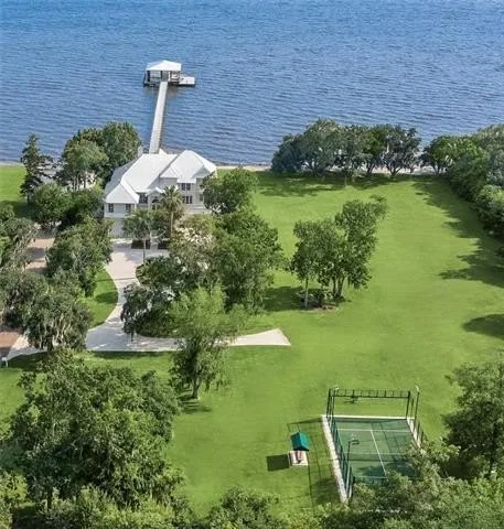 Vacation year-round in one of the most magnificent properties in Historic Lewisburg! Situated on three lots directly on Lake Pontchartrain, this home offers panoramic views from every room and Lake breezes from the many outdoor porches and patios. A spacious living room has a soaring ceiling and French doors which open to the wonderful screened-in porch with outdoor tv. A separate den with wet bar offers room to spread out, and the dining room with walls of glass bring the outdoors in. The kitchen has professional appliances and quartz counters, and an adjacent climate controlled wine cellar. The fabulous owner's suite features a spa-like luxurious bath and a private study. There is abundant storage under the home, and also a climate controlled gym, a full bath and a ground-level patio for those lakefront barbecues and crawfish boils. An elevator and whole-house generator round out the property. The current owner constructed a new 500' long all steel and fiberglass pier with an 18 ton boat lift, improved the grounds with grading, underground drainage and irrigation, re-built the exterior staircase, completed the ground floor and added epoxy flooring, and added a Padel Tennis court.