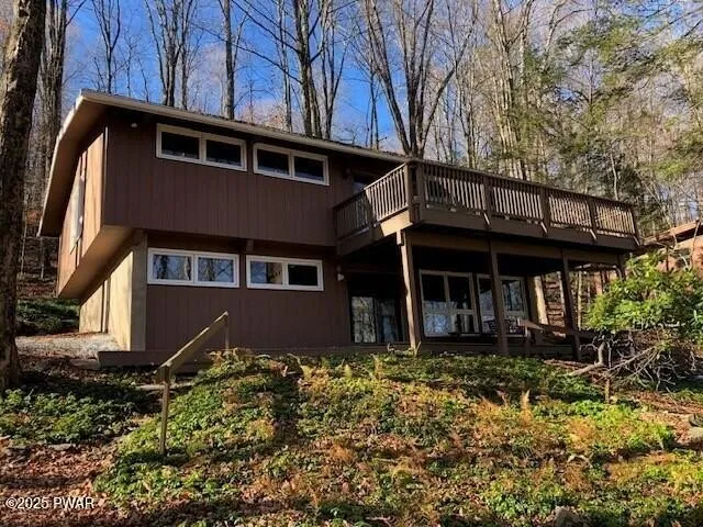 Desirable ''Pennwood on the Lake'' community with a Boat Slip is where you will find this 2nd Tier home within walking distance to the lake. The 1st Floor offers 2 Bedrooms, 1 Bath, spacious eat-in-kitchen with custom stone FP, Living Room with additional custom stone FP, Sliders opening onto a 10'x24' Deck with seasonal Lake Wallenpaupack lake views, wood floors, vaulted wood T&G ceiling and exposed beams. Walk across the road to the Pennwood private beach and nearby boat slip. The Lower Level is unfinished BUT all rooms have studded walls and electric wiring, concrete floor, wood T&G ceiling with exposed beams. The rooms include 2 Bedrooms, 1 Bath, Laundry Room with sink, Den with custom floor to ceiling stone FP and Double sliders leading to the Lower Deck. Also includes a detached storage shed for those extra's.